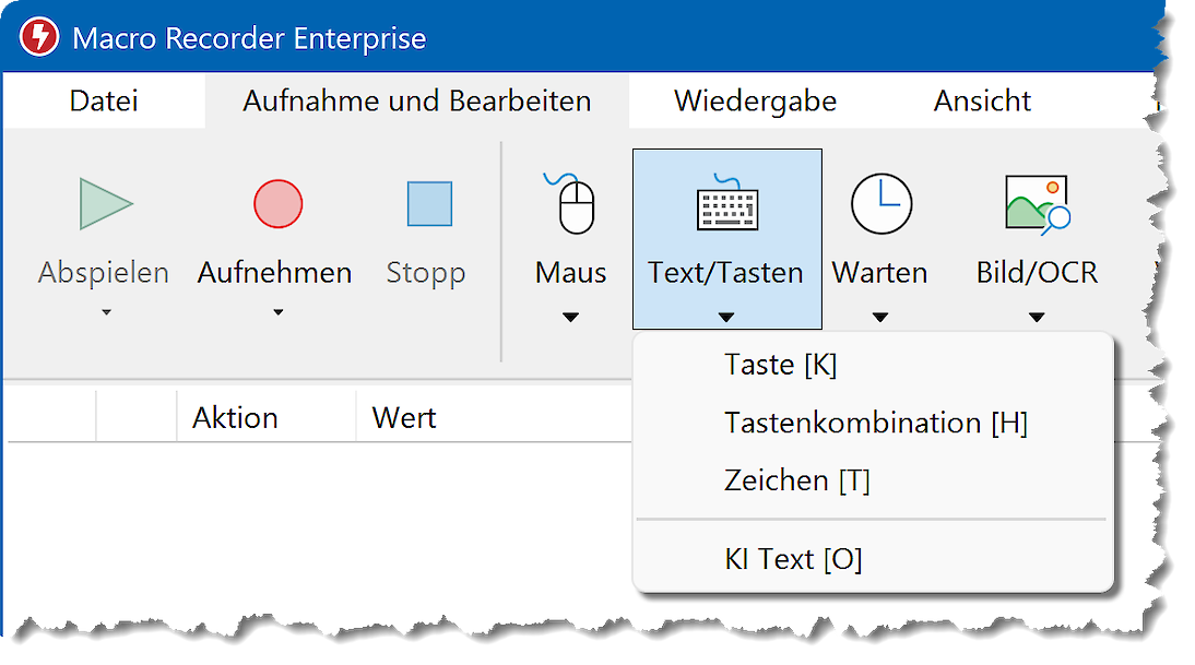 Macro Recorder erfasst einzelne Tastendrücke, mit und ohne SHIFT-, CTRL-, ALT- und WIN-Modifikatortasten. Mehrere Buchstaben-Tastenbetätigungen können zu einer Textausgabe kombiniert werden.