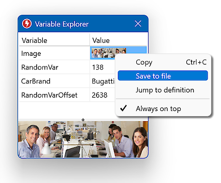 The Variable Explorer lists all variables and their text/image contents that are created/updated during playback of a macro script for debugging purposes:
