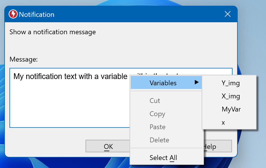 The message box text may include variables. To add a variable to the text, right-click in the input box and select the desired variable: