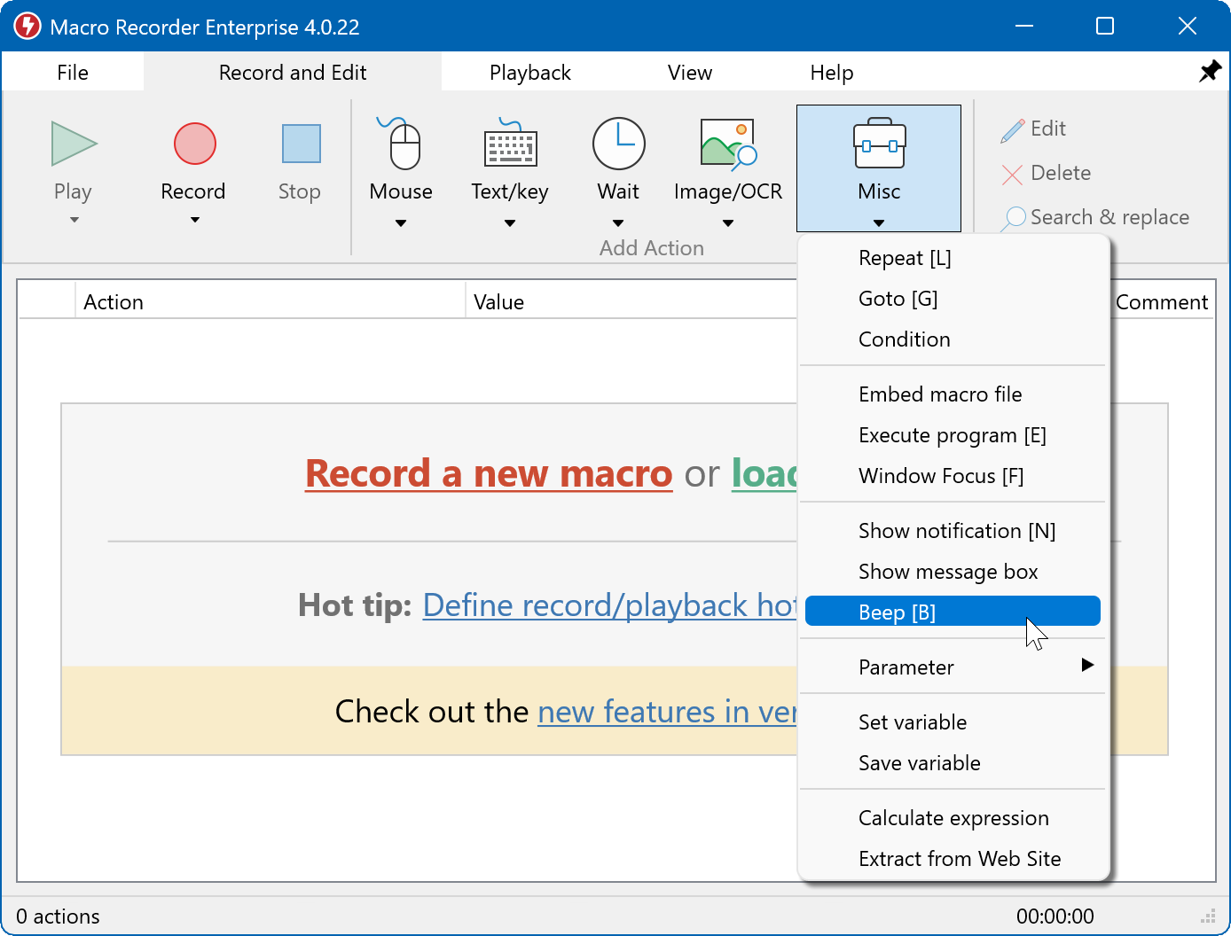 The beep action outputs a system beep, for example to let you know when a specific script section has been reached or an error section of your script has been called.