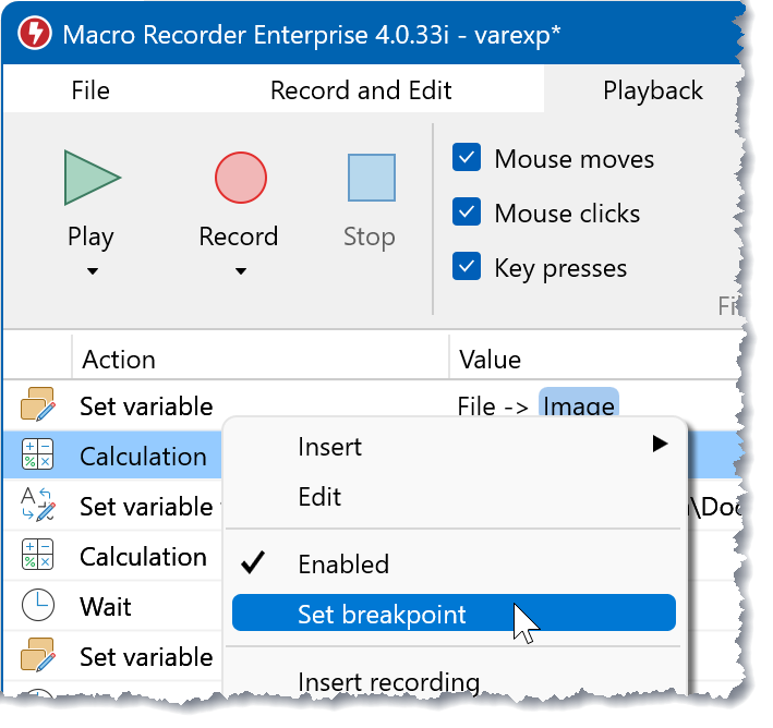 Breakpoints can help to debug your automation script. To set a breakpoint, right-click the action where you wish to set a breakpoint: