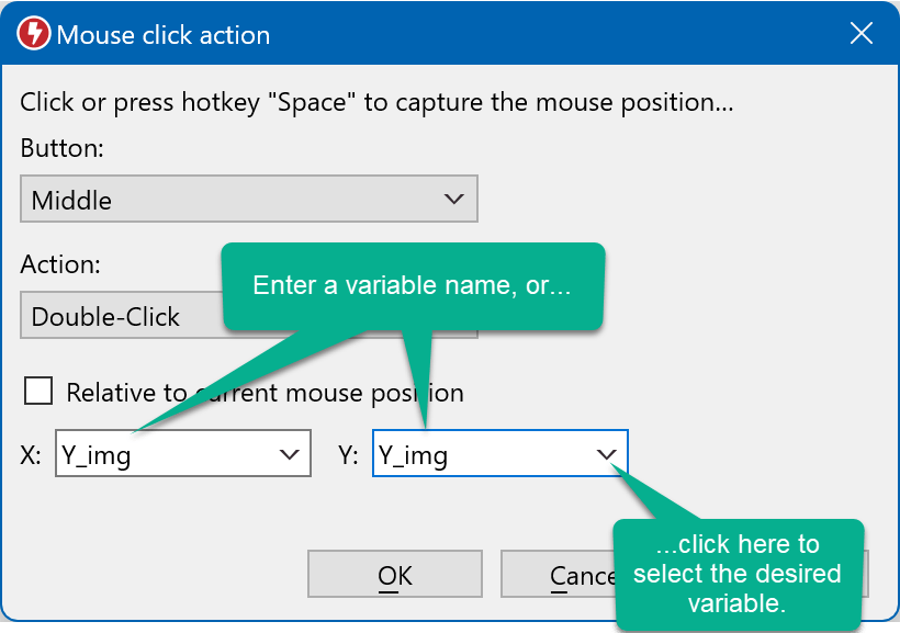 Zum Beispiel kann Macro Recorder die X/Y-Position eines Bildes auf dem Bildschirm ermitteln und die X- und Y-Koordinaten in den Variablen"ImgX" und"ImgY" speichern. Diese Variablen werden später von einer Mausklickaktion verwendet, die auf die in diesen Variablen gespeicherte X/Y-Koordinate klickt.