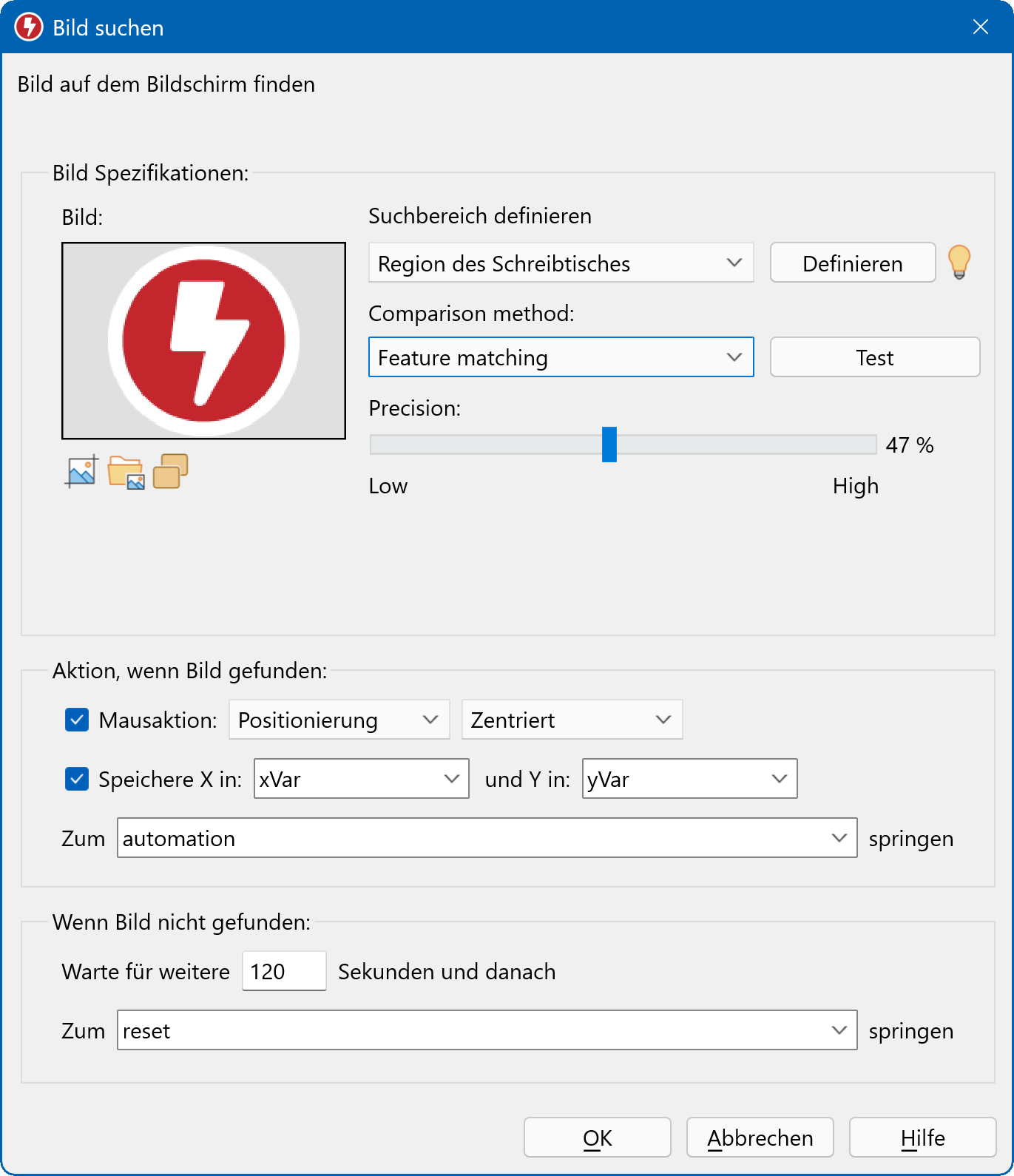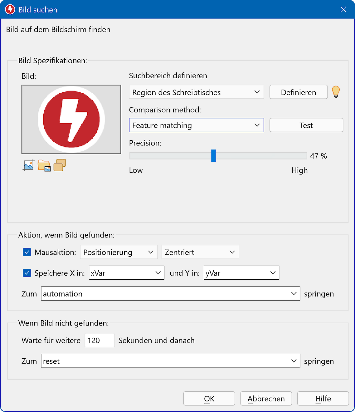 Bei Erscheinen des Bildes innerhalb des definierten Suchbereichs setzt Macro Recorder den Mauszeiger auf Wunsch an die Fundstelle und fährt mit der Makroausführung fort oder springt zu einer beliebigen Stelle des Makros, die über das Label definiert wird.