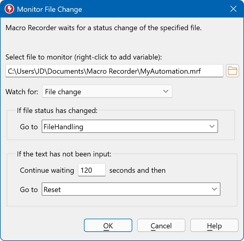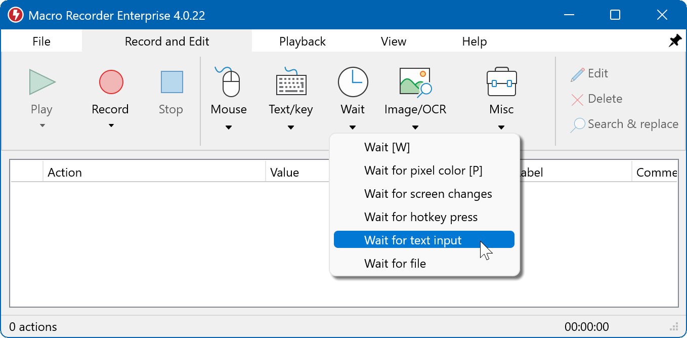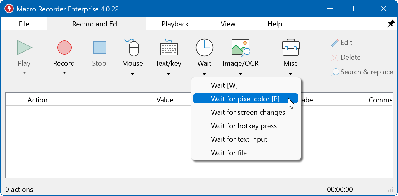 Macro Recorder can pause the macro playback for a defined time in milliseconds, wait for a keypress, text input, file change event, pixel color change or appearance of a bitmap or text in a customizable area of the computer desktop.