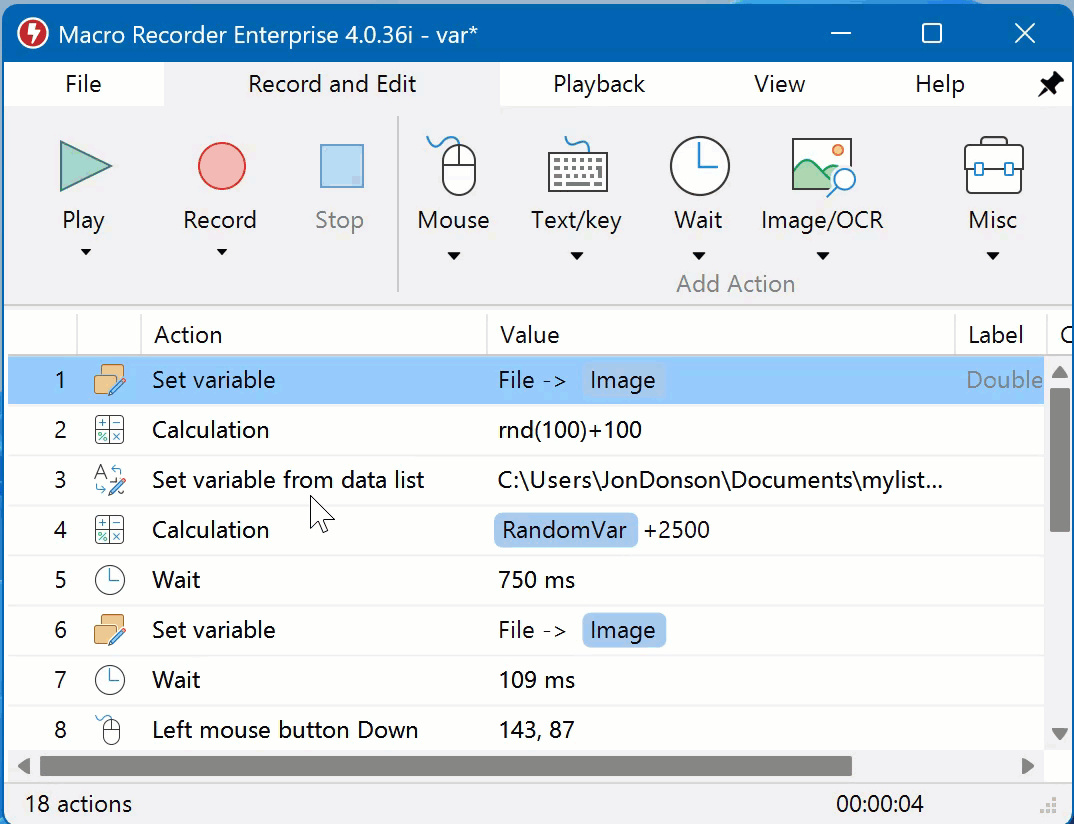 Macro Recorder recordings consist of individual action steps in chronological order: