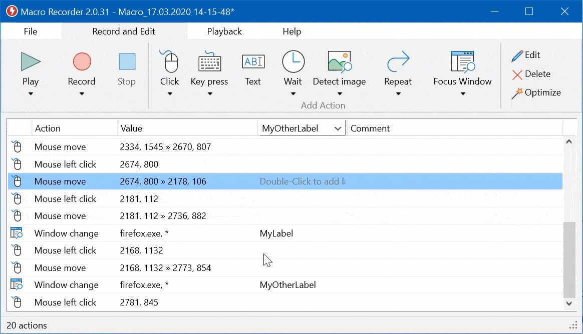 You can enter a comment for each action in the column "comment". Comments serve no other purpose than describing the use of the action for you. You can enter any text.