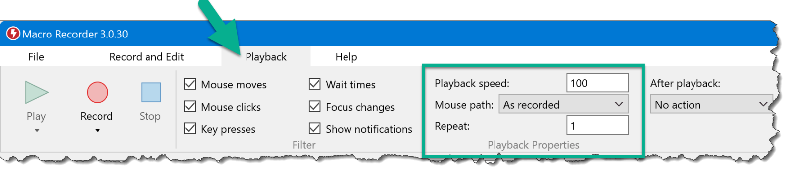 Tab "" on the Macro Recorder main menu allows you to configure the playback speed, the mouse path shape and number of repetitions: