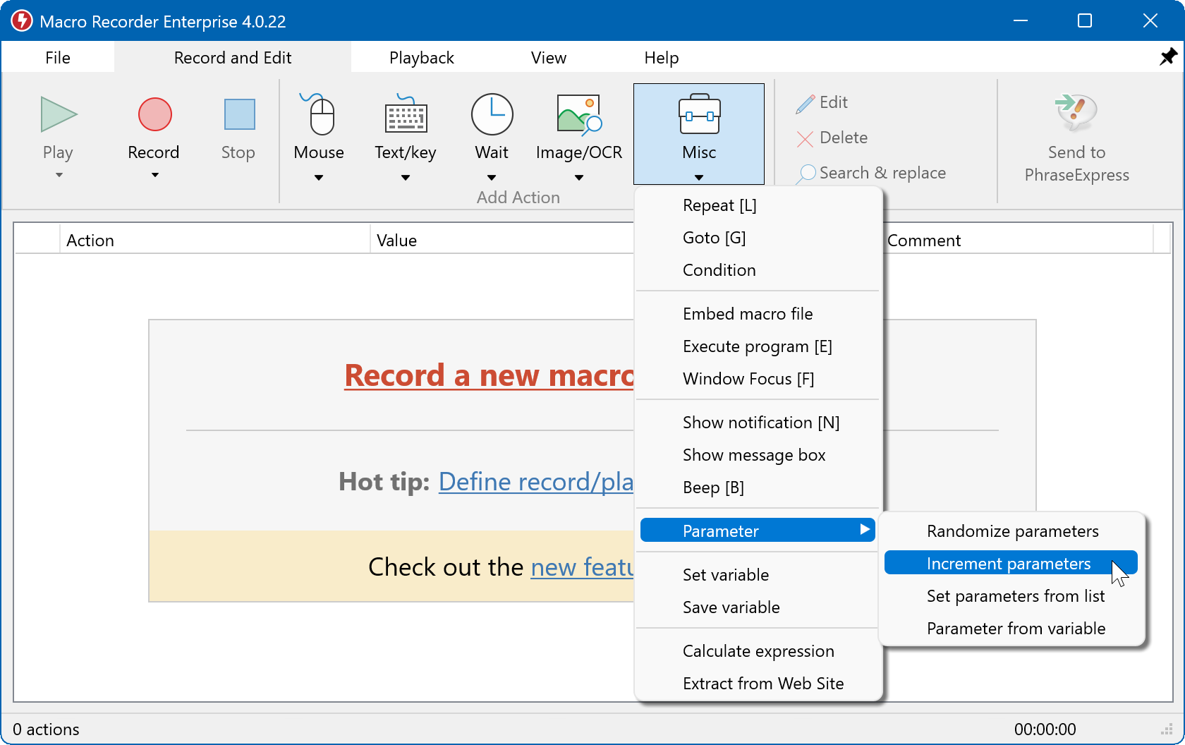 Deprecated: Macro Recorder Enterprise Edition can change parameters of other actions for each repetition (by using either the goto or repeat action). It can increment/decrement a parameter, randomize parameters and use a list of parameters in file to replace static parameters of your actions: