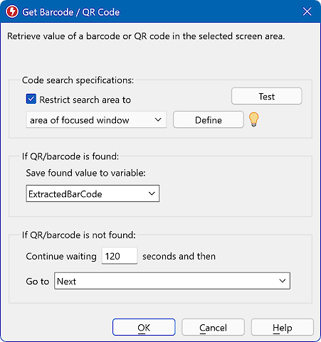 This action extracts the encoded data from a barcode or QR code within a defined desktop region and saves the result into a variable: