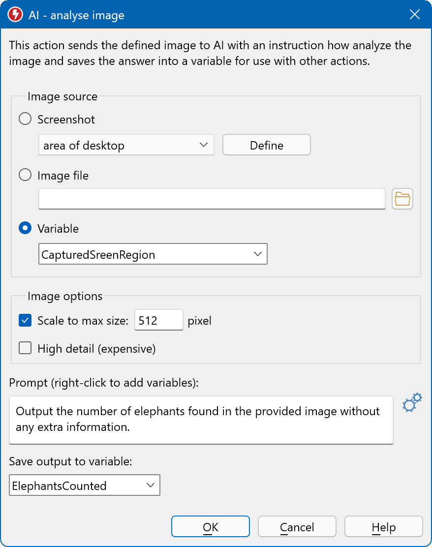 This AI image analysis action can send a a bitmap image together with an instruction ("prompt") to the AI engine and save the answer into a variable for further use in your macro script.