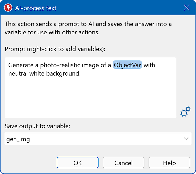 Macro Recorder can utilize the AI services to generate a bitmap based on your description (aka "prompt") and saves the picture into a variable for further use in Macro Recorder.