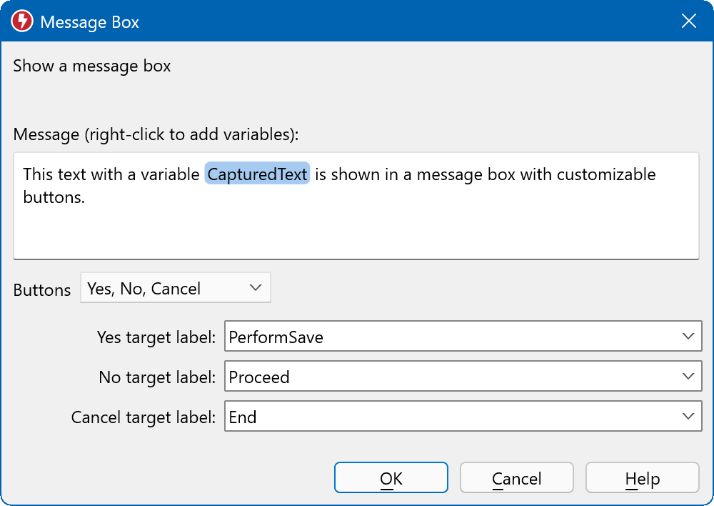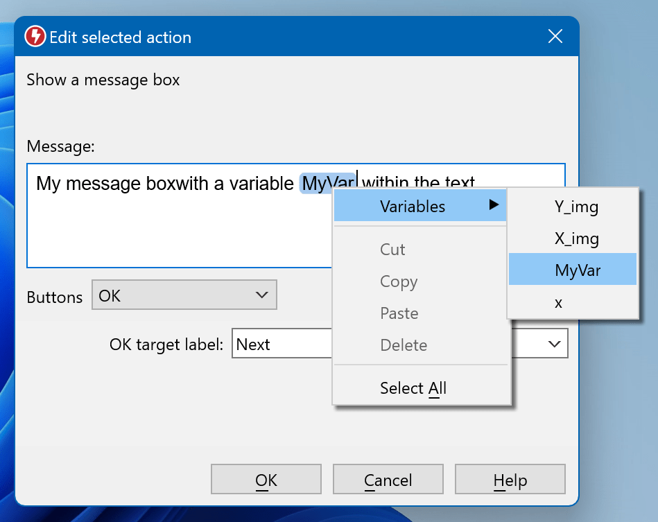 The message box text may include variables. To add a variable to the text, right-click in the input box and select the desired variable: