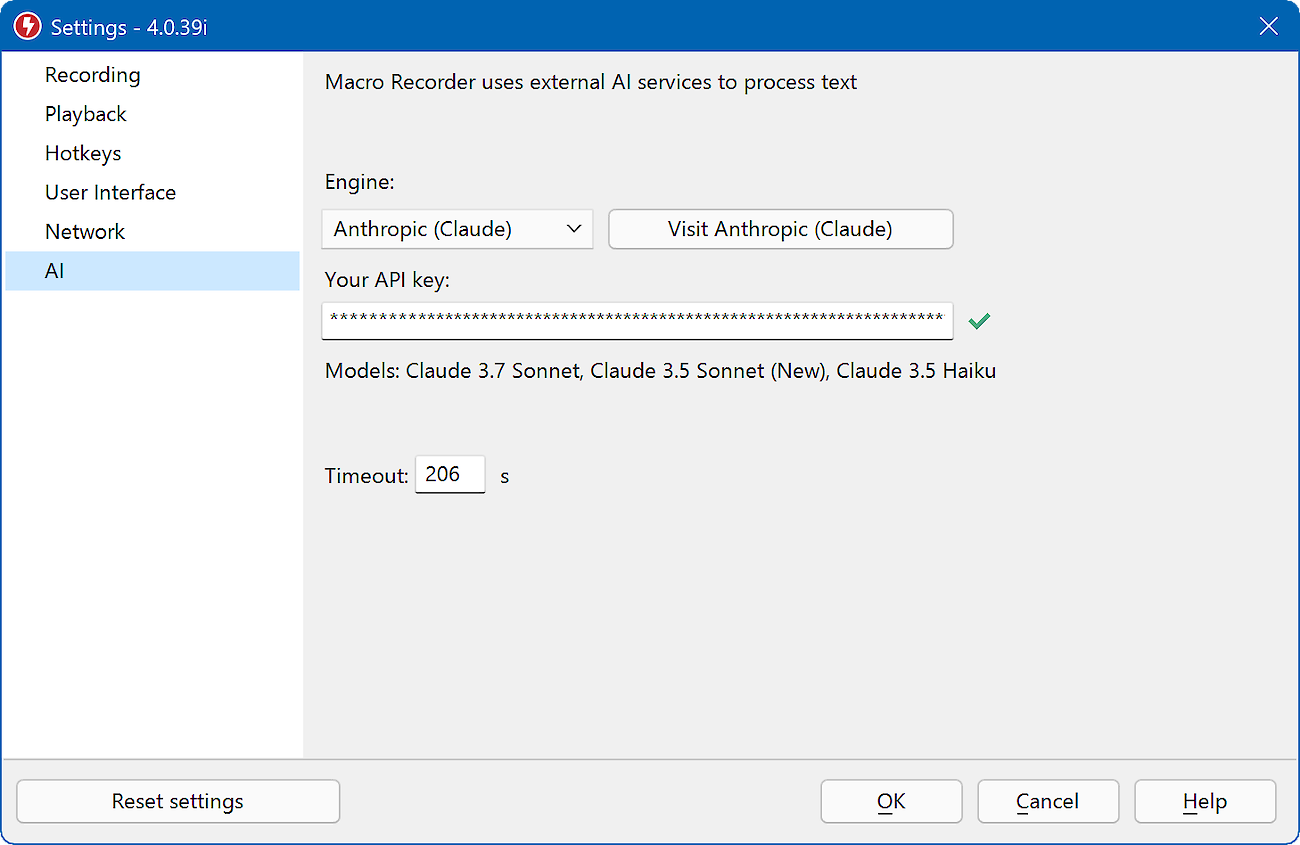 Before you can use AI features in Macro Recorder, the desired cloud-based or self-hosted AI engine(s) must be initialized in Macro Recorder in a one-time procedure: