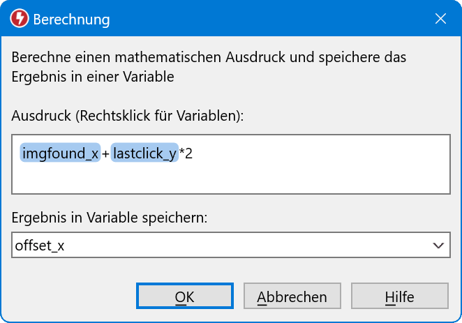 Mit dieser Funktion können Sie zum Beispiel Zähler erstellen, den Abstand zwischen mehreren auf dem Bildschirm gefundenen Bildern oder Texten berechnen oder Mauskoordinaten-Offsets berechnen.