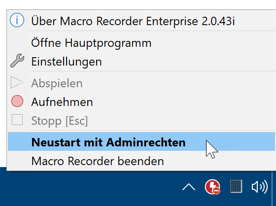 - Wenn die zu steuernde Anwendung mit Administratorrechten gestartet wurde, aber Macro Recorder mit normalen Anwenderrechten läuft, erscheint im Startleistensymbol ein rotes Hinweissymbol: