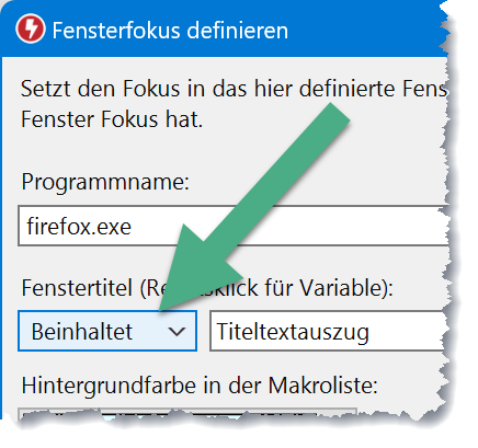- Erwägen Sie die Option "enthält" statt "genau" zu wählen, um o.a. auftretende Änderungen des Fenstertitels bei der späteren Makrowiedergabe zu berücksichtigen.