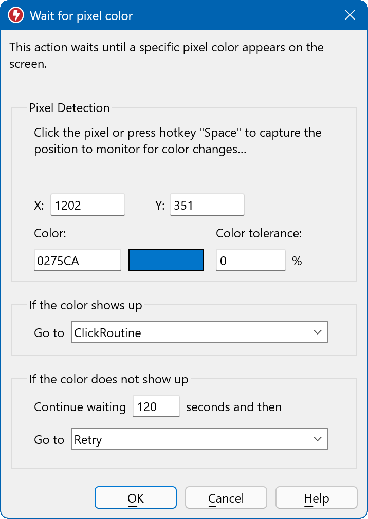 The "pixel color detection" action monitors the color change of a specific pixel. If the pixel changes to the defined color, the macro continues with the action, specified by the label (default is the next step).