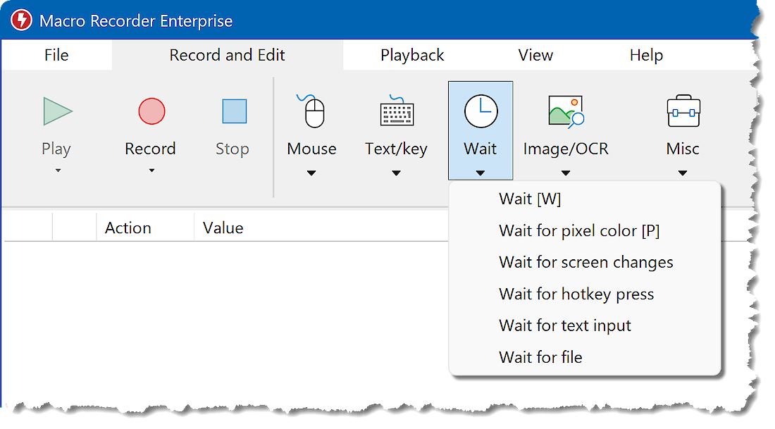 Macro Recorder can pause the macro playback for a defined time in milliseconds, wait for a keypress, text input, file change event, pixel color change or appearance of a bitmap or text in a customizable area of the computer desktop.