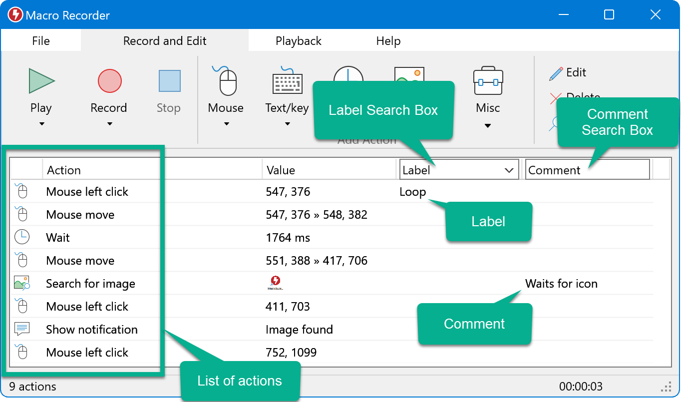 Macro Recorder recordings consist of individual action steps in chronological order: