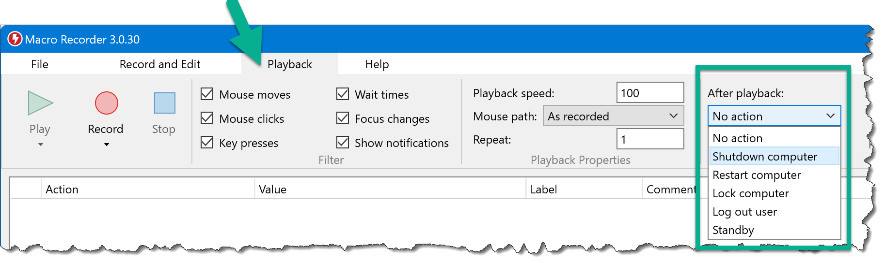 - SHIFT-click the play button to playback the script from the currently selected action until the end.